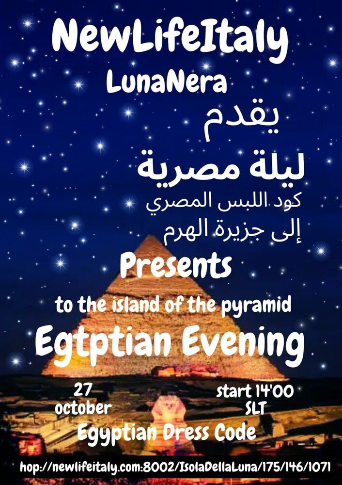 أمسية مصرية Egyptian evening serata Egiziana31 minutes ago | 2025-10-27 14:00 SLT | IsolaDellaLuna | Added by LunaNeraأنتم جميعاً مدعوون إلى الأمسية المصرية الرائعة، الكثير من الموسيقى، ويمكنكم العثور في جزيرة الهرم على الملابس المصرية للرجال والنساء للسهرة. نحن في انتظاركم. You are all invited to the wonderful Egyptian evening, with lots of music, and you can find Egyptian clothing for men and women for the evening on Pyramid Island. We are waiting for you.