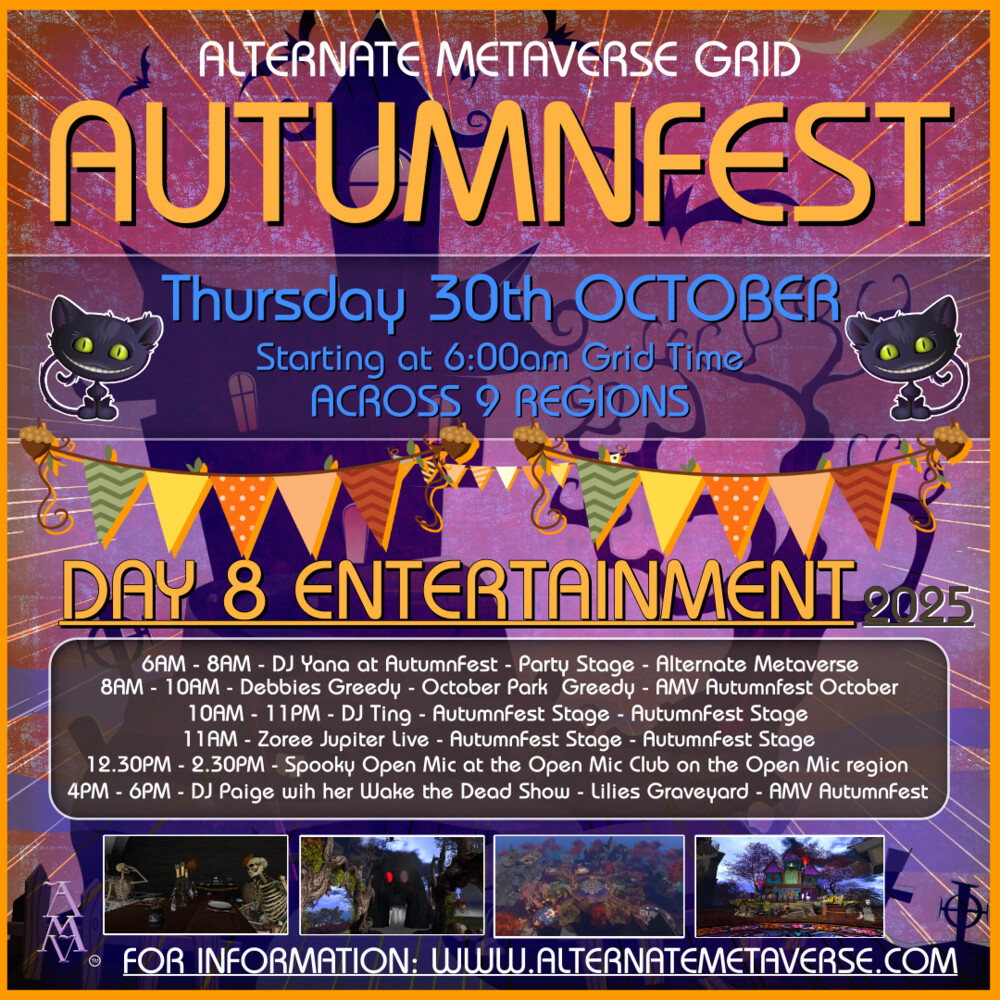 Lilies Graveyard A spooky venue for some of the best DJs in OpenSim, Costume welcome, created by Lilie Finesmith, owner of Bare Lilies. hop://alternatemetaverse.com:8002/AMV%20AutumnFest/536/256/33 ref:DP