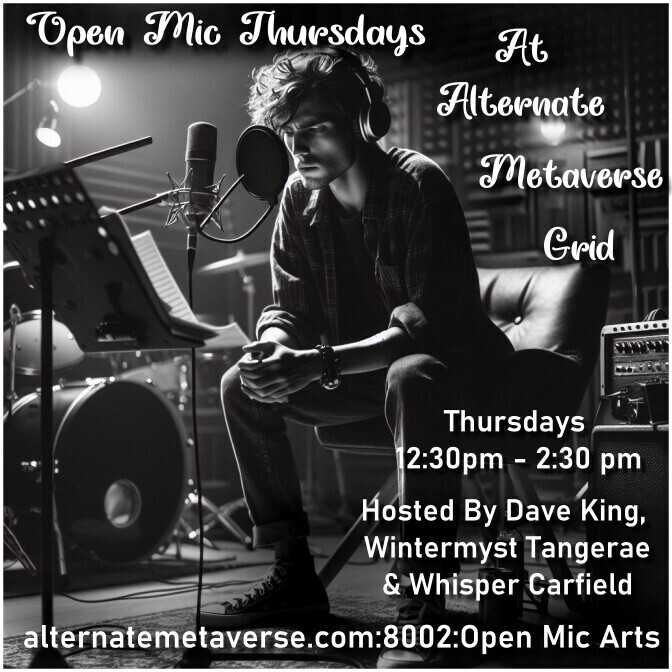 Open Mic Thursdays! accepting talent by avatars throughout Alternate Metaverse & The OpenSim Hypergrid as well! Live Open Mic events are on Thursdays from 12:30-2:30pm, Hosted by Dave King, Wintermyst Tangerae & Whisper Carfield! We accept people in the order of which they sign up. Some of the talent will include: