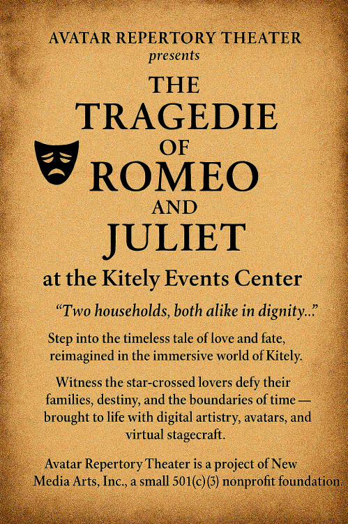 Join Avatar Repertory Theater every Friday at 5PM Grid Time (Pacific) at the Kitely Events Center for our ongoing Shakespeare workshops. We read directly from a transcription of the First Folio, live in Vivox voice — and you’re invited to be part of the scene.