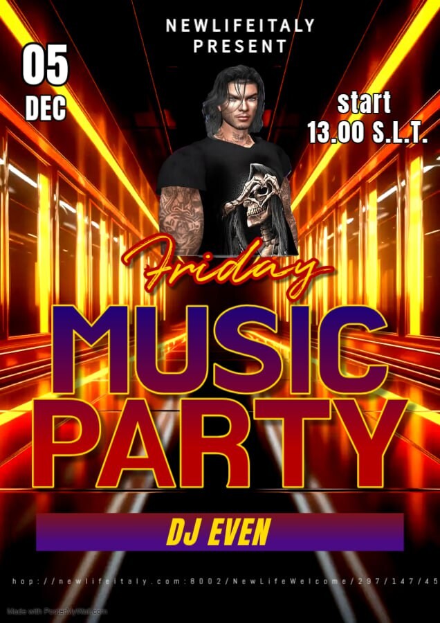 Date: December 5th Time: 13:00 PM SLT DJ Guest: DJ Even Location: New Life Italy - Welcome Get ready for great energy.. DJ Even will light up the night with an unforgettable music selection! Don’t miss it… see you on the dance floor!