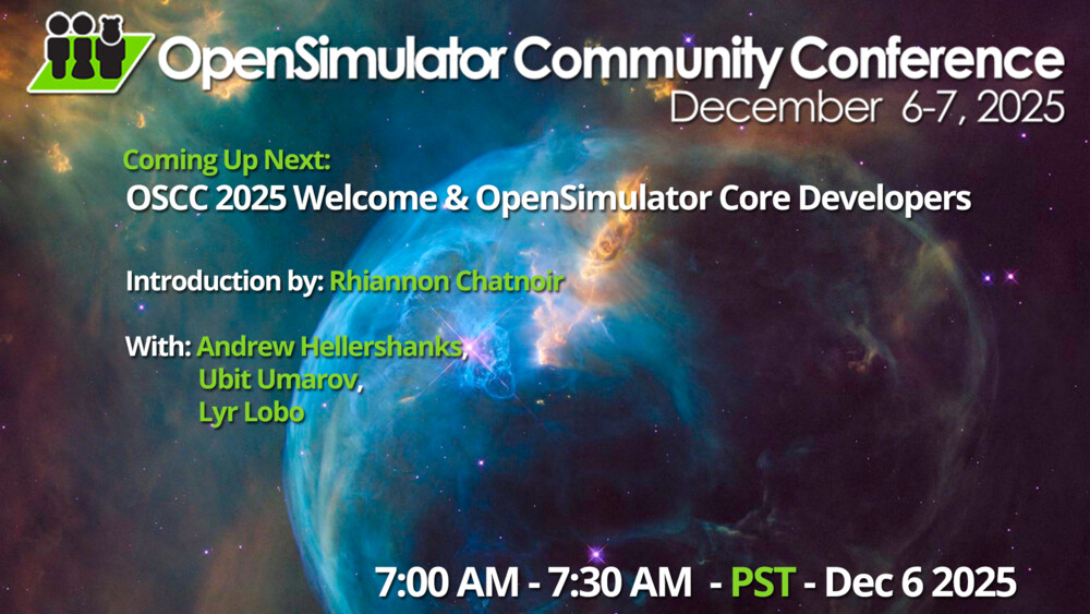 Welcome to the 12th annual OpenSimulator Community Conference. This year’s event features presenters across the globe who will be highlighting the user projects and core development work of the OpenSimulator platform. We will kick off #OSCC25 with an overview of the latest features in the OpenSimulator software update and conversation with Core Developers of the platform.