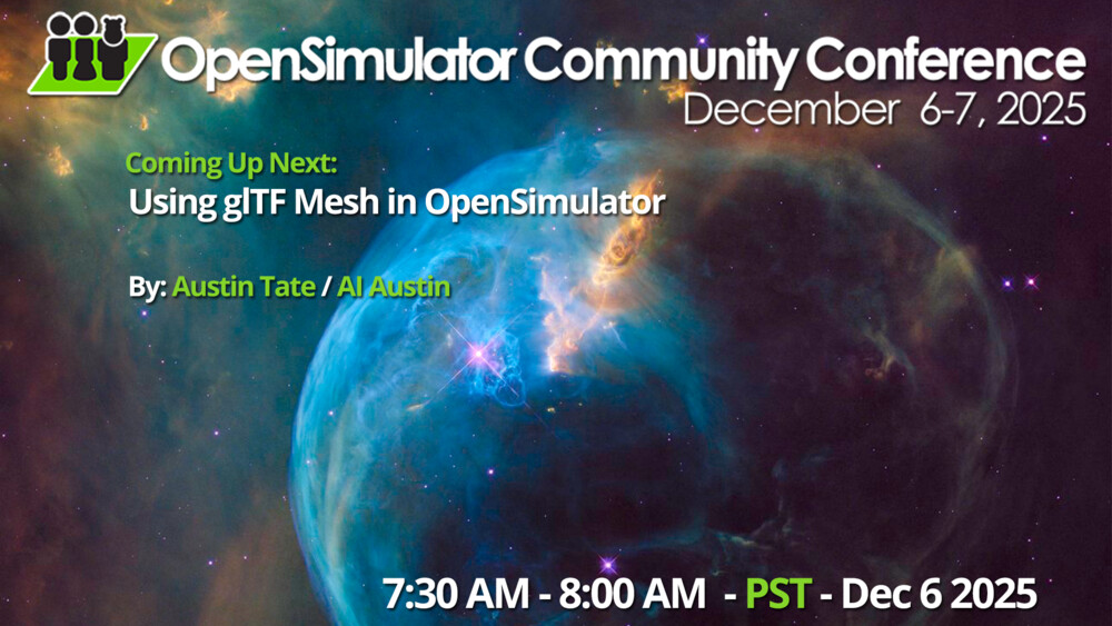 This presentation will describe some of the lessons learned and experience gained while testing glTF mesh import to Second Life and OpenSim and tips for ways to get the best out of using glTF mesh in OpenSim.
