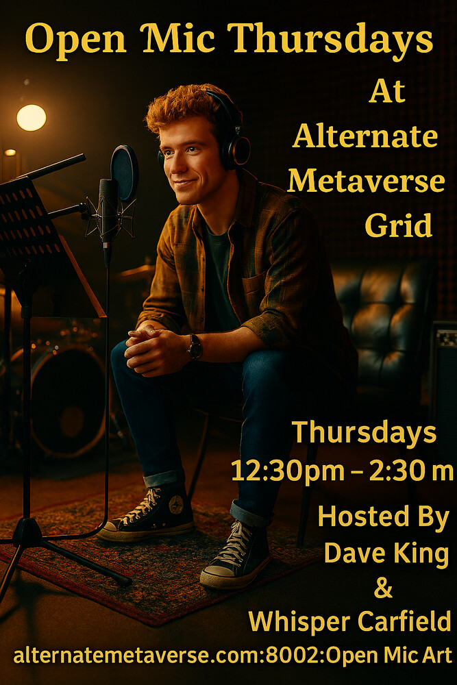 Come show off your talents at AMV Open Mic Sing live, play your instrument, make us laugh, read your poem, or share a short story hop://alternatemetaverse.com:8002/Open%20Mic%20Arts/230/41/51