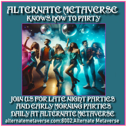 Late Night Parties 10pm-1am at The Party Stage, Alternate Metaverse. Join in the fun, socialize and share Snacks & Drinks from the Cafe'. Greedy is available for anyone wanting to have a game! Always great music and a great crowd! We are looking forward to seeing you all