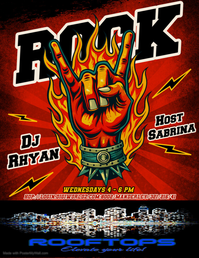 Get ready to Partayyyyyyy! Dj Rhyan and host Sabrina will rock your world tonight at Rooftops! 4 - 6 pm. hop://login.digiworldz.com:8002/Manderley/321/216/41