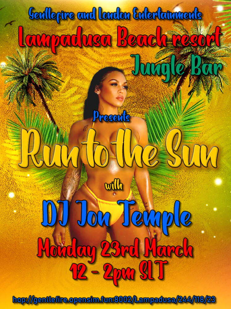 Bit of a change for today as we head over to Lampadusa in Gentlefire. Run to the sun for some fabulous summer tunes in the awesome Tropical Jungle bar in Lampadusa. DJ Jon will be playing the tunes so get ya summer clothes on and joi8n us for this truly summery event. hop://gentlefire.opensim.fun:8002/Lampadusa/240/120/23