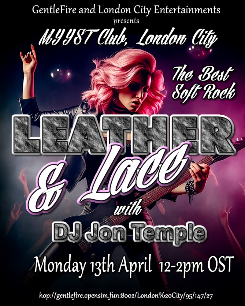 Get ready for two hours of Soft Rock classics from the 70's and 80's. DJ Jon Temple will be spinning the sounds at the fabulous Myyst Club in London City, Gentle Fire grid. 12 m- 2pm Grid time.