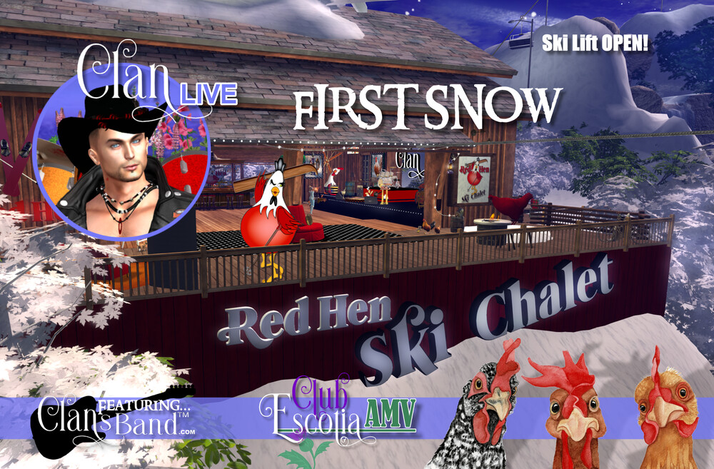 CLAN LIVE with Clan's Band FIRST SNOW at the Red Hen Ski Chalet 1 PM FRIDAYin 22 hours | 2025-11-21 13:00 SLT | Club Escotia | Added by Webby MerlinFirst Snow of the Season! SKI LIFT IS OPEN! New original songs by Clan's Band to debut... Dress warmly it's CHILLY on the mountain!