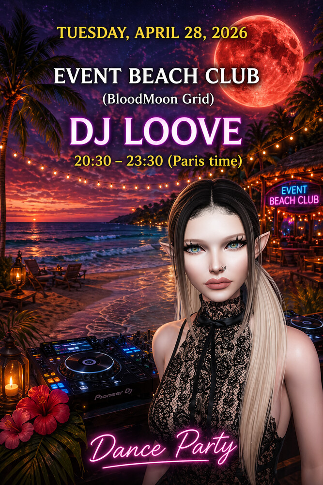 Tuesday, April 28, 2026 8:30 p.m. Paris time 11:30 AM (SL TIME,PST) hop://bloodmoonpack.com:8002/Event%20Beach%20Club/128/128/2 Events page: https://bloodmoonpack.com/grid/events/view.php?id=45 https://opensimworld.com/events/135364 0 comments |