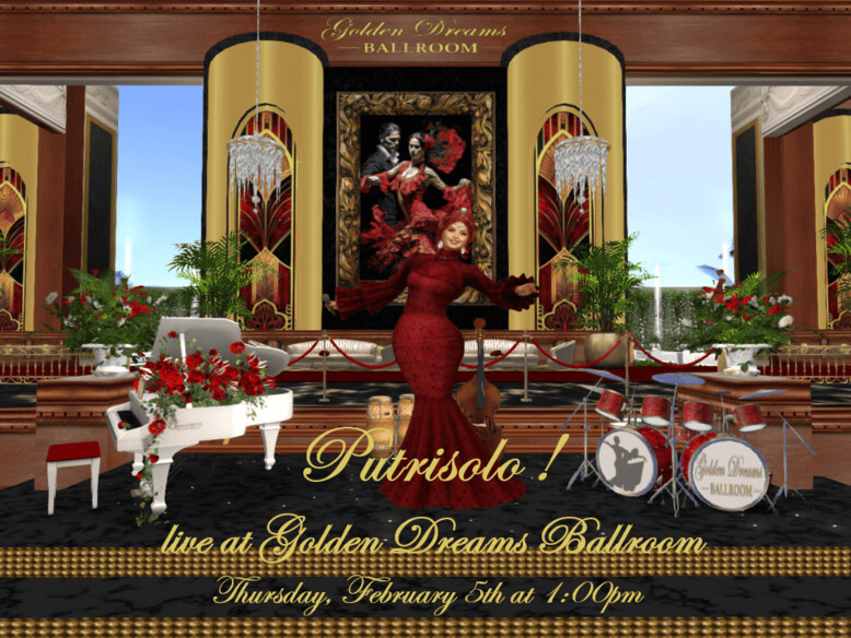 Putrisolo sings LIVE at the Golden Harmony Ballroom at 1:00pm!in 2 days | 2026-02-05 13:00 SLT | Mermaid's Cove | Added by Jojo and HarmonyShe's back! And she will be on the first Thursday of every month at 1:00! The Golden Dreams Ballroom is proud to have Putrisolo sing for you here, love songs, rock, pop, country.... you name it...she sings it! She's got such a sweet voice and her laughter is contagious! Put all of that on a beautiful (FUN!) Ballroom stage and you have the perfect event on a Thursday afternoon! Not ya mama's ballroom!!