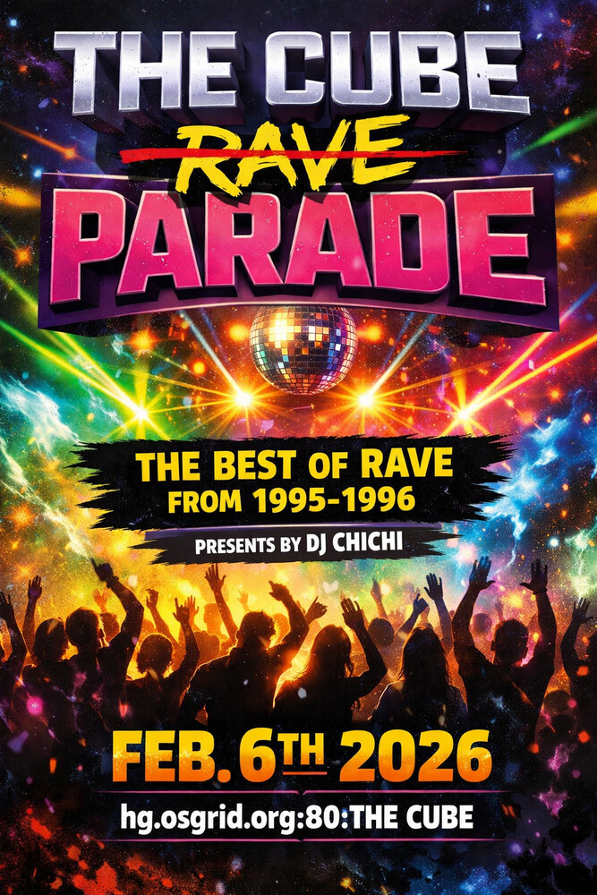 The Cube Rave Paradein 3 days | 2026-02-06 11:00 SLT | The Cube | Added by ChiChi CuteyThe Cube Love Parade ...The Best of Rave from 1995-1996.....presents by DJ ChiChi......Feb. 6th 2026.....hg.osgrid.org:80:The Cube.....11:00am Grid Time