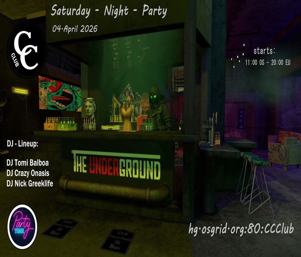 Saturday/Samstag 04.04.2026 ◕ starts 11:00 OS grid time – startet ab 20:00 Uhr EU DJ Line UP: ☊ DJ Tomi Balboa Livemix 20:00-21:00 DJ Crazy Onasis Synth Wave,Italo,Darkwave,Goth Livemix 21:00-22:00 DJ Nick Greeklife Livemix 22:00 – 23:00 Taxi: hg.osgrid.org:80:CCClub ░░▒▓◙█◙█◙ THE - UNDERGROUND ◙█◙█◙▓▒░░ 0 comments |
