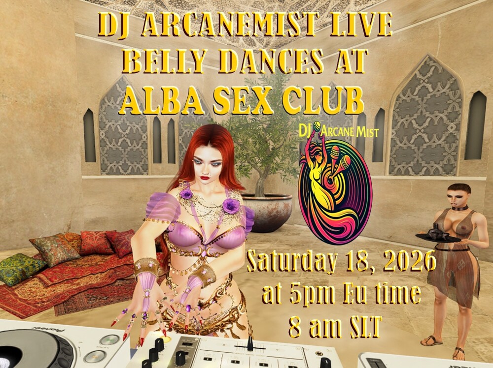 Date: April 18, 2026 Time: 8:00 AM – 10:00 AM (OSGrid Time) - 5:00 PM (Europe Time Start) Step into a world of hypnotic rhythms, flowing beats, and exotic vibes. Let the music move you through a journey of traditional and modern belly dance sounds. Come dance, relax, and feel the magic. alba princess (hg.osgrid.org:80:ALBA SEX CLUB) April 13, 2026 0 comments |