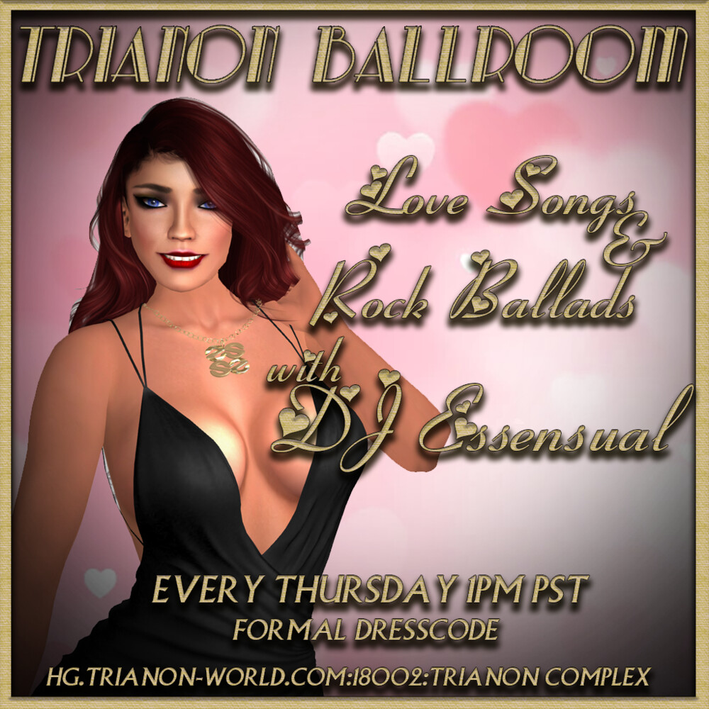 Love Songs and Ballads with DJ Essensual Continuesin 2 days | 2026-04-30 14:00 SLT | Trianon Complex | Added by Essensual✦Do you love to dance to soft music, and chat with a group of friendly people or with your partner? If yes, then Trianon's Ballroom is the perfect place for you to be on Thursdays at 1:00 pm PST. The talented DJ Essensual will spin some ballads and timeless love songs at 1pm. Trianon offers a unique dance ball, an experience found nowhere else. Dress code formal venue,and you will need a special group tag offered in the landing area