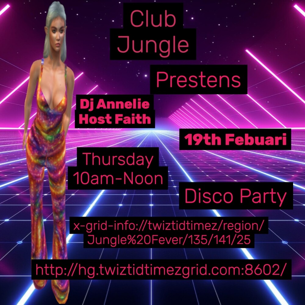 ? Date: 19th Febuari ? Time: 10 AM - Noon ? Location: Twisttimegrid, Club Jungle Come dance the morning away as DJ Annelie spins your favorite tracks and takes all your requests and dedications! Don’t miss out on this unforgettable 2-hour disco extravaganza! ?? Bring your friends and let’s make some memories together! ? See you there! x-grid-info://twiztidtimez/re 0 comments |