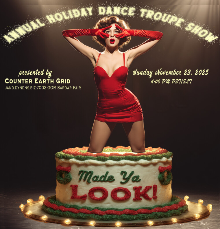 Counter Earth Dance Troupe is looking for DANCERS for our Holiday Show and eventsin 17 days | 2025-11-21 09:23 SLT | GOR Sardar Fair | Added by kindra TurianDancers!!! If you love to dance our holiday show will be starting practices and we are looking for more dancers to join- no experience necessary- pose ball dancing at it's finest- costumes free- performance is Nov 21, 2025 and practices will be every Tues night at 6 p.m pacific time. Please reach out to me with any interest in participating.