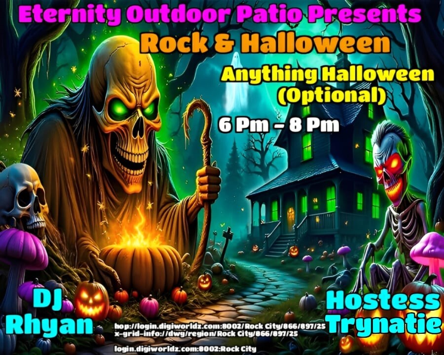 |   | HALLOWEEN PARTY With DJ Rhyan Creed and Hostess Trynatie Mason at the Eternity PATIO Venue!in 9 hours | 2025-10-31 18:00 SLT | Rock City | Added by Trynatie Mason*6-8PM OST Grid Time! - Ready For Some Fun? Join Us! - THEME: Anything Halloween - MUSIC: Rock - *GUARANTEED A GOOD TIME, CYA THERE! login.digiworldz.com:8002:Rock City hop://login.digiworldz.com:8002/Rock%20City/866/897/25 0 comments |