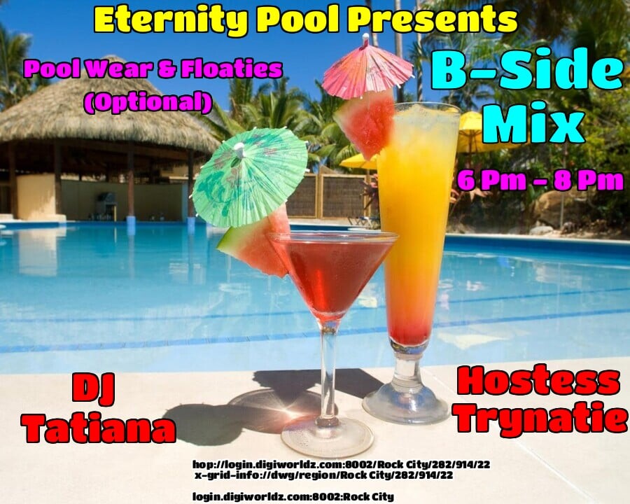 DJ Tatiana Volare and Hostess Trynatie Mason-Curle at the Eternity POOL Venue!in 23 hours | 2026-04-28 18:00 SLT | Rock City | Added by Trynatie Mason6-8PM OST Grid Time - *Ready For Some Fun? Join Us! - THEME: Pool Wear & Floatie (FREE) - MUSIC: B-Side Mix - RAFFLE: by Cosplay Universe HG FRIENDLY! *GUARANTEED A GOOD TIME, CYA THERE!