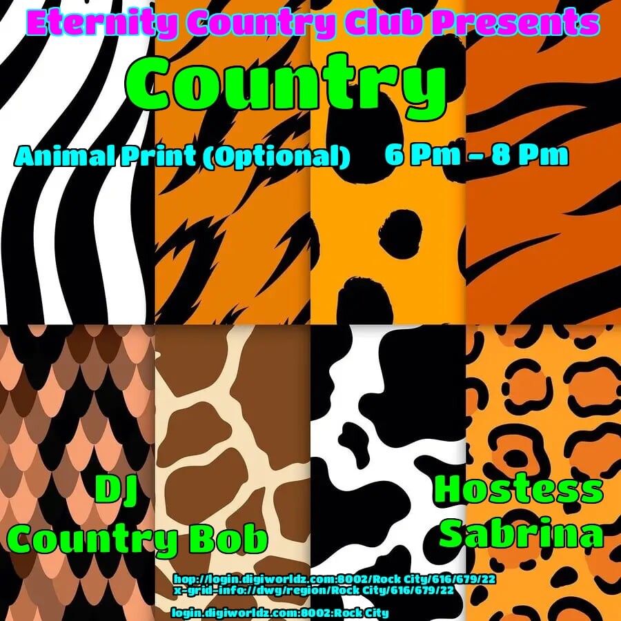 DJ Country Bob and Hostess Sabrina Dementros at the Eternity COUNTRY Venue!in 3 days | 2026-04-30 18:00 SLT | Rock City | Added by Trynatie Mason*6-8PM OST Grid Time! - Ready For Some Fun? Join Us! - THEME: Animal Print - Music: Country - Bull Rides for a Prize* GUARANTEED A GOOD TIME, CYA THERE!