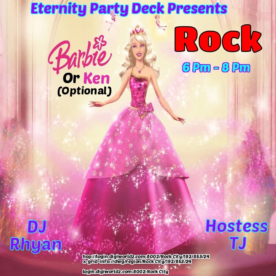 DJ Rhyan Creed and Hostess TJ Mason at the Eternity DECK Venue!in 4 days | 2026-05-01 18:00 SLT | Rock City | Added by Trynatie Mason*6-8PM OST Grid Time! - Ready For Some Fun? Join Us! - THEME: Barbie or Ken - MUSIC: Rock - *GUARANTEED A GOOD TIME, CYA THERE!