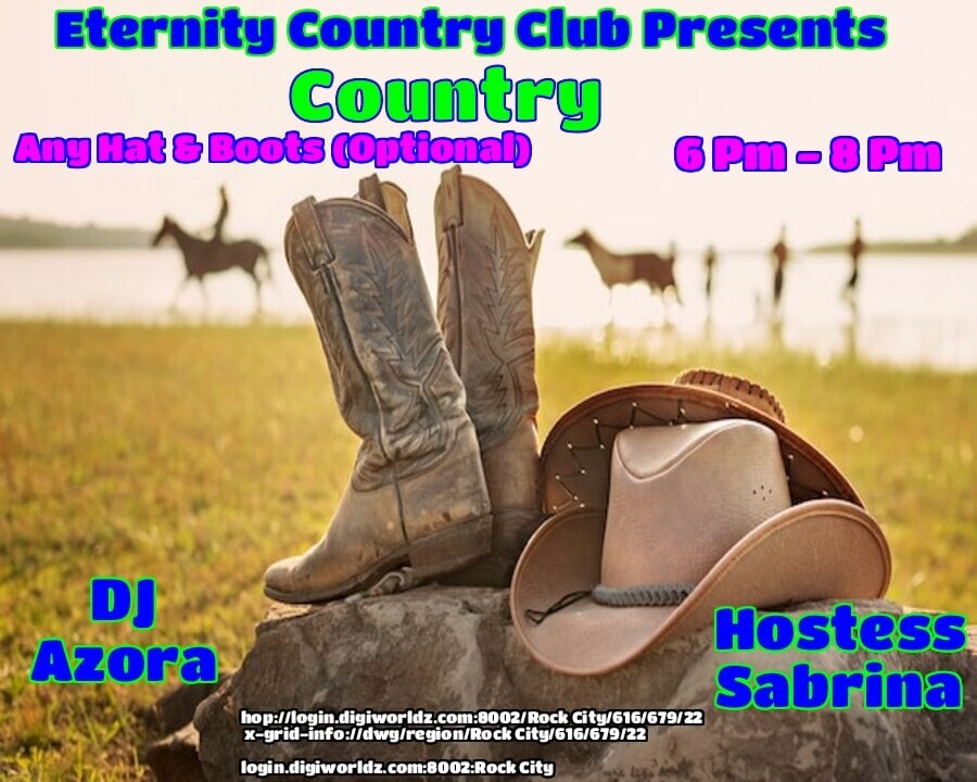 |   | DJ Azoramyth Destiny and Hostess Sabrina Dementros at Eternity COUNTRY Venue!in 3 days | 2025-11-03 18:00 SLT | Rock City | Added by Trynatie Mason*6-8PM OST GRID TIME* Ready For Some Fun? Join Us Tonight! - THEME: Any Hat & Boots - MUSIC: Country - Bull Rides For a Prize - GUARANTEED A GOOD TIME, CYA THERE! login.digiworldz.com:8002:Rock City hop://login.digiworldz.com:8002/Rock%20City/616/679/22 0 comments |