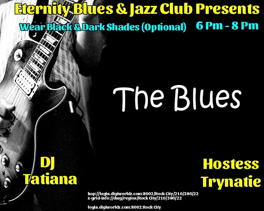 |   | DJ Tatiana Volare and Hostess Trynatie Mason at the Eternity BLUES/JAZZ Venue!in 4 days | 2025-11-04 18:00 SLT | Rock City | Added by Trynatie Mason6-8PM OST Grid Time - *Ready For Some Fun? Join Us! - THEME: Wear Black & Dark Shades - MUSIC: Blues - RAFFLE: by Tat's Builds a Ocean Plat Form (Tatiana Volare) - HG FRIENDLY! - *GUARANTEED A GOOD TIME, CYA THERE! login.digiworldz.com:8002:Rock City hop://login.digiworldz.com:8002/Rock%20City/210/386/22 0 comments |