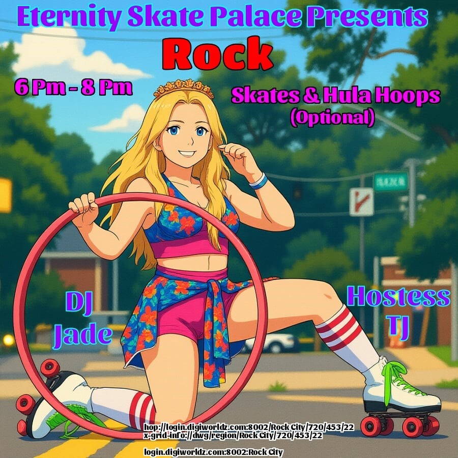 |   | DJ Jade Soraya and Hostess TJ Mason at the Eternity Night Club - SKATE PALACE Venue!in 5 days | 2025-11-05 18:00 SLT | Rock City | Added by Trynatie Mason*6-8PM OST Grid Time* - Ready For Some Fun? Join Us at the Skate Palace! - THEME: Skates & Hula Hoops - MUSIC: Rock - RAFFLE: By River Island Fashions HG Friendly! - GUARANTEED A GOOD TIME, CYA THERE! login.digiworldz.com:8002:Rock City hop://login.digiworldz.com:8002/Rock%20City/720/453/22 0 comments |