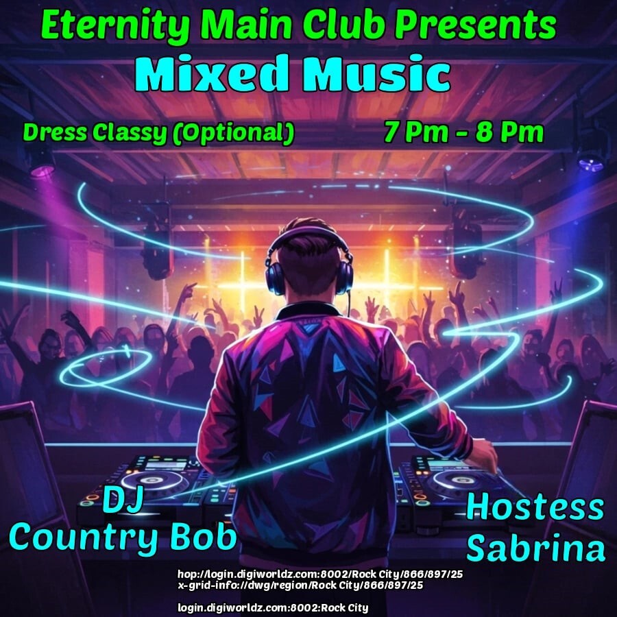 |   | DJ Country Bob and Hostess Sabrina at the Eternity Night Club MAIN Venue!in 6 days | 2025-11-06 19:00 SLT | Rock City | Added by Trynatie Mason*6-8PM OST Grid Time! - Ready For Some Fun? Join Us! - THEME: Dress Classy - Music: Mixed - *GUARANTEED A GOOD TIME, CYA THERE! login.digiworldz.com:8002:Rock City hop://login.digiworldz.com:8002/Rock%20City/866/897/25 0 comments |