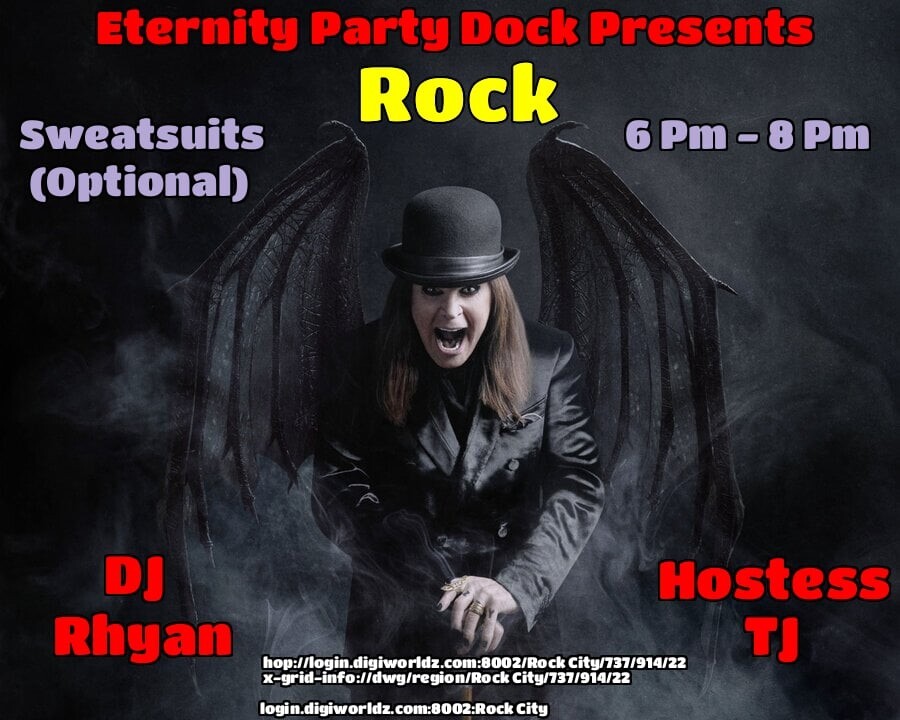 |   | DJ Rhyan Creed and Hostess Sabrina Dementros at the Eternity DOCK Venue, & A BIRTHDAY!in 7 days | 2025-11-07 18:00 SLT | Rock City | Added by Trynatie Mason*6-8PM OST Grid Time! - Ready For Some Fun? Join Us! - THEME: SweatSuit - MUSIC: Rock - *GUARANTEED A GOOD TIME, CYA THERE! login.digiworldz.com:8002:Rock City hop://login.digiworldz.com:8002/Rock%20City/737/914/22 0 comments |