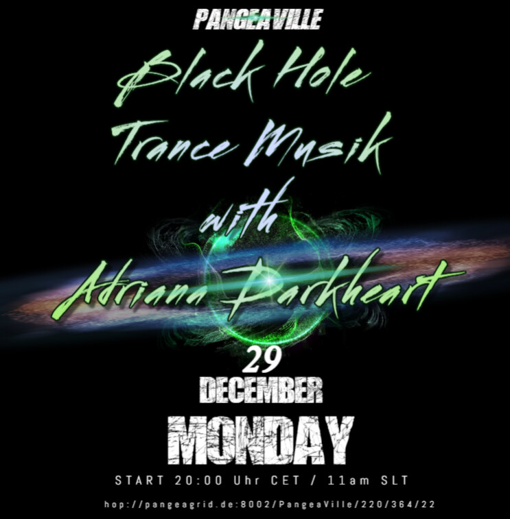 Trance Tuesdayin 5 hours | 2025-12-23 06:00 SLT | PangeaVille | Added by AdrianaDarkheartAdriana Darkheart plays a mix of techno, trance(vocal) and christmas music.