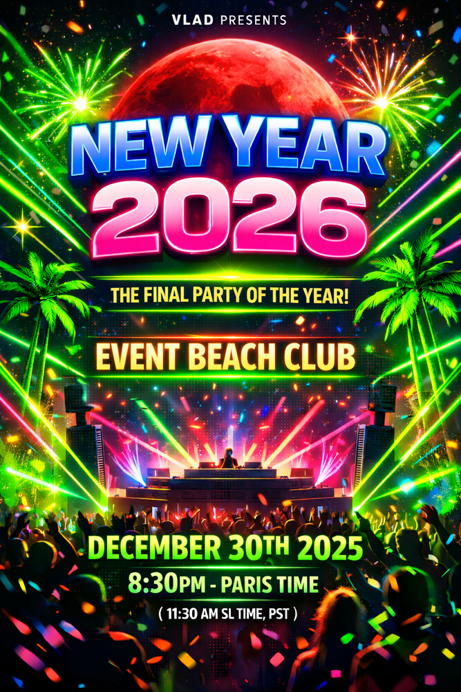 The last party of 2025 Tuesday, December 30, 2025 8:30 p.m. Paris time 11:30 AM (SL TIME,PST) hop://bloodmoonpack.com:8002/Event%20Beach%20Club/128/128/2 Events page: https://bloodmoonpack.com/grid/events/view.php?id=26 https://opensimworld.com/events/130906 0 comments |