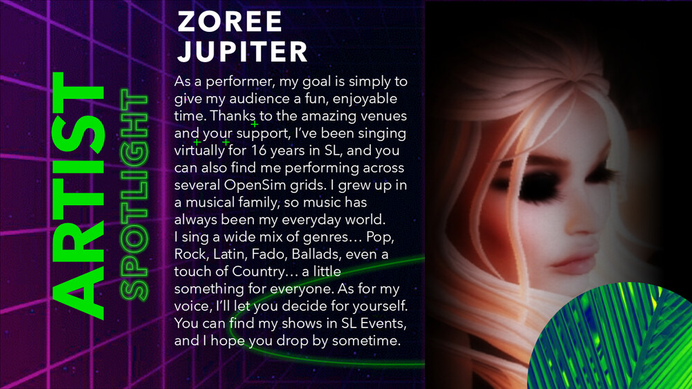 OSCC25 Music with Zoree Jupiterin 22 hours | 2025-12-05 12:00 SLT | OSCC Music Stage | Added by AvaCon Inc.✦✔Coming from an extremely musical family, Teresa Bettencourt has performed in many real life venues (including Carnegie Hall) as well as over the past 12 years as avatar Zoree Jupiter in the virtual worlds of Second Life and OpenSimulator. Her broad musical range includes a repertoire of over 700 songs which helps her focus her shows on song requests where Zoree delivers with a blend of the beautiful sounds of her native Portugal and her love of the music of the U.S.
