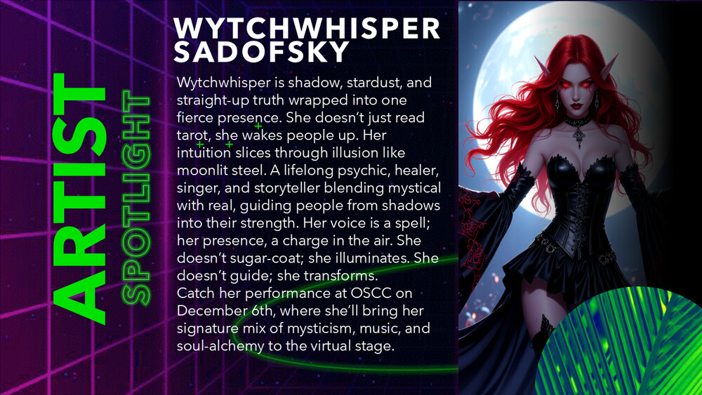 OSCC25 Live Music with Wytchwhisper Sadofskyin 2 days | 2025-12-06 18:00 SLT | OSCC Music Stage | Added by AvaCon Inc.✦✔Wytchwhisper is a sultry, sensuous singer/songwriter blending torch song elegance with a playful, fairy-like vibe. Performing covers from artists like Adele, Diana Krall, Aerosmith and her own original music, Wytchwhisper’s unique vocals promise stress-reducing melodies, humor, and a touch of the unexpected. Requests welcome – sung in English or Domestic Cat (please specify with your request)!