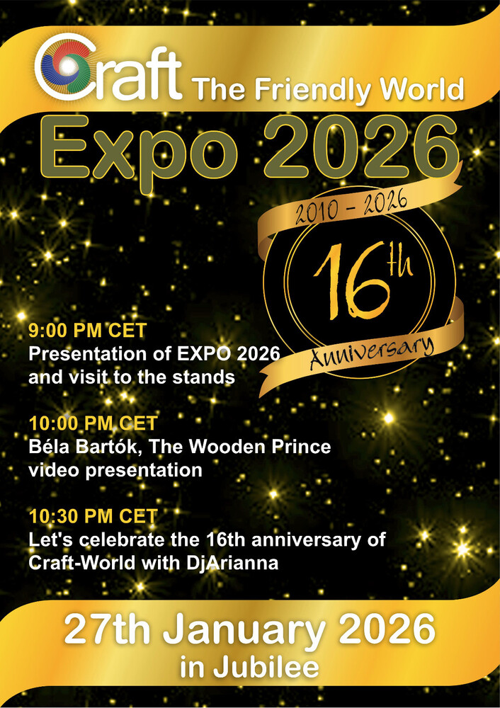 EXPO for Craft World's 16th birthday at Jubilee sim Schedule: 9:00 p.m. Presentation of the Expo and visit to the stands 10:00 p.m. Presentation of the video ‘Bela Bartok The Wooden Prince’ 10:30 p.m. Party for Craft's 16th birthday with DJ Arianna 0 comments |