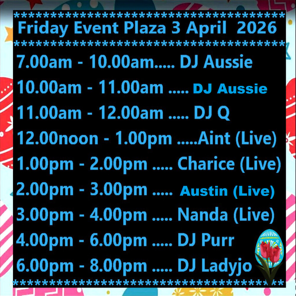 Friday Event Plaza Osgridin 13 hours | 2026-04-10 14:00 SLT | Event Plaza | Added by OSgrid.orgLive Singers & DJ's (Continued Easter celebrations)