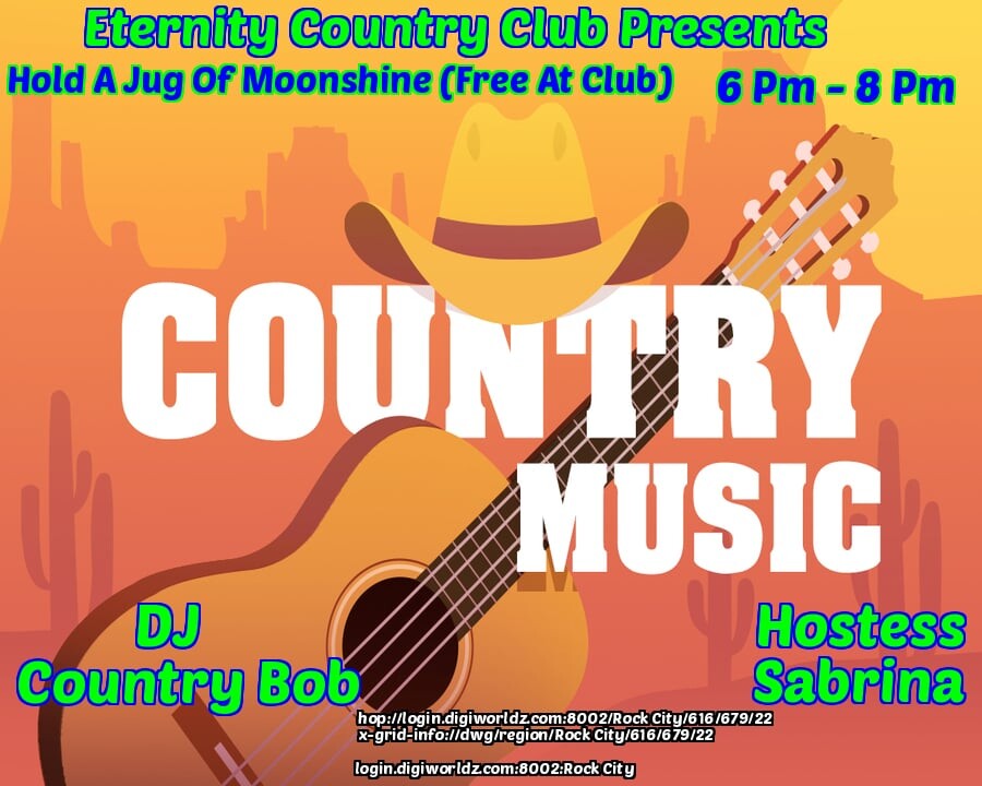 DJ Country Bob and Hostess Sabrina Dementros at the Eternity COUNTRY Venue!in 7 days | 2026-04-09 18:00 SLT | Rock City | Added by Trynatie Mason*6-8PM OST Grid Time! - Ready For Some Fun? Join Us! - THEME: Hold a Moonshine Jug - Music: Country - Bull Rides for a prize *GUARANTEED A GOOD TIME, CYA THERE!