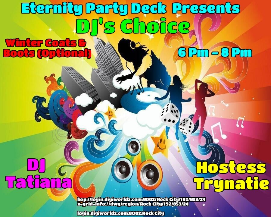 DJ Tatiana Volare and Hostess Trynatie Mason at the Eternity DECK Venue!in 14 hours | 2025-12-30 18:00 SLT | Rock City | Added by Trynatie Mason6-8PM OST Grid Time - *Ready For Some Fun? Join Us! - THEME: Winter Coat & Boots - MUSIC: DJs Choice - RAFFLE: by Cosplay Gothic A Dark Moon Outfit, HG FRIENDLY! *GUARANTEED A GOOD TIME, CYA THERE!