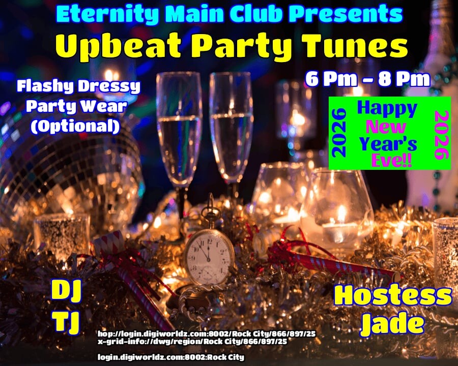 DJ TJ Mason & Hostess Jade Soraya at the Eternity Night Club - MAIN Venue! NEW YEARS EVE PARTY!in 2 days | 2025-12-31 18:00 SLT | Rock City | Added by Trynatie Mason*6-8PM OST Grid Time* - *Ready For Some Fun? Join Us! - THEME: Flashy, Dressy Party Wear - MUSIC: Up Beat Party Tunes - Raffle HG by River Island Fashions HG Friendly! *GUARANTEED A GOOD TIME, CYA ON THE DANCE FLOOR!
