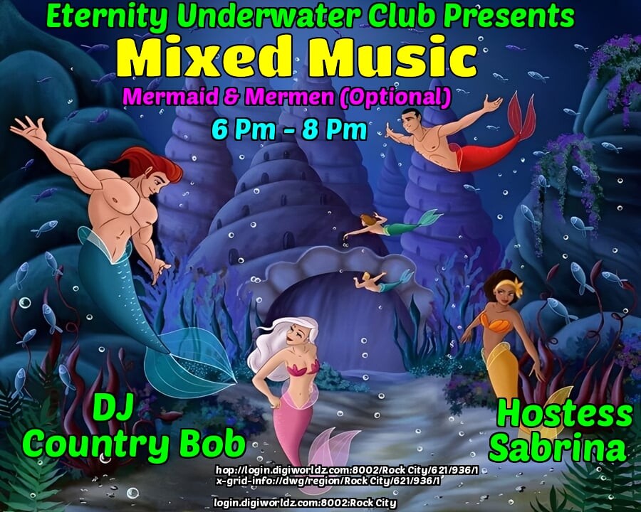DJ Country Bob and Hostess Sabrina Dementros at Eternity UNDERWATER Venue!in 4 days | 2026-02-23 18:00 SLT | Rock City | Added by Trynatie Mason*6-8PM OST GRID TIME* Ready For Some Fun? Join Us Tonight! - THEME: Mermaid & Mermen - MUSIC: Mixed - GUARANTEED A GOOD TIME, CYA THERE!