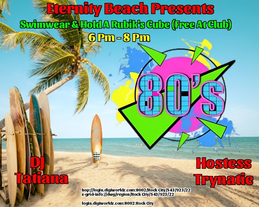 DJ Tatiana Volare and Hostess Trynatie Mason at the Eternity BEACH Venue!in 5 days | 2026-02-24 18:00 SLT | Rock City | Added by Trynatie Mason6-8PM OST Grid Time - *Ready For Some Fun? Join Us! - THEME: Swim Wear & Hold a Rubix Cube (FREE) - MUSIC: 80s - RAFFLE: by Cosplay Universe, HG FRIENDLY! *GUARANTEED A GOOD TIME, CYA THERE!