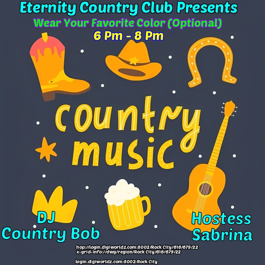 DJ Country Bob and Hostess Sabrina Dementros at the Eternity COUNTRY Venue!in 7 days | 2026-02-26 18:00 SLT | Rock City | Added by Trynatie Mason*6-8PM OST Grid Time! - Ready For Some Fun? Join Us! - THEME: Wear Your Favorite Color - Music: Country - Bull Rides For A Prize *GUARANTEED A GOOD TIME, CYA THERE!