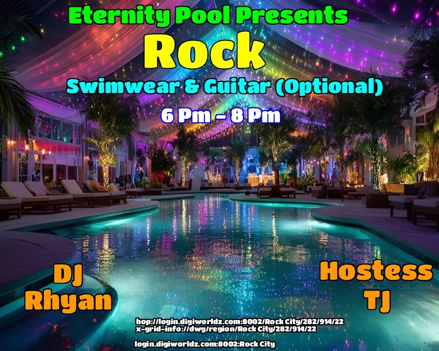DJ Rhyan Creed and Hostess TJ Mason at the Eternity POOL Venue!in 8 days | 2026-02-27 18:00 SLT | Rock City | Added by Trynatie Mason*6-8PM OST Grid Time! - Ready For Some Fun? Join Us! - THEME: Swim Wear & Guitar - MUSIC: Rock - *GUARANTEED A GOOD TIME, CYA THERE!