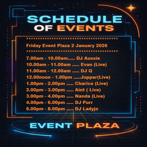 Friday Event Plaza Osgridin 16 hours | 2026-01-02 10:00 SLT | Event Plaza | Added by OSgrid.org✦DJ's and Live Singers