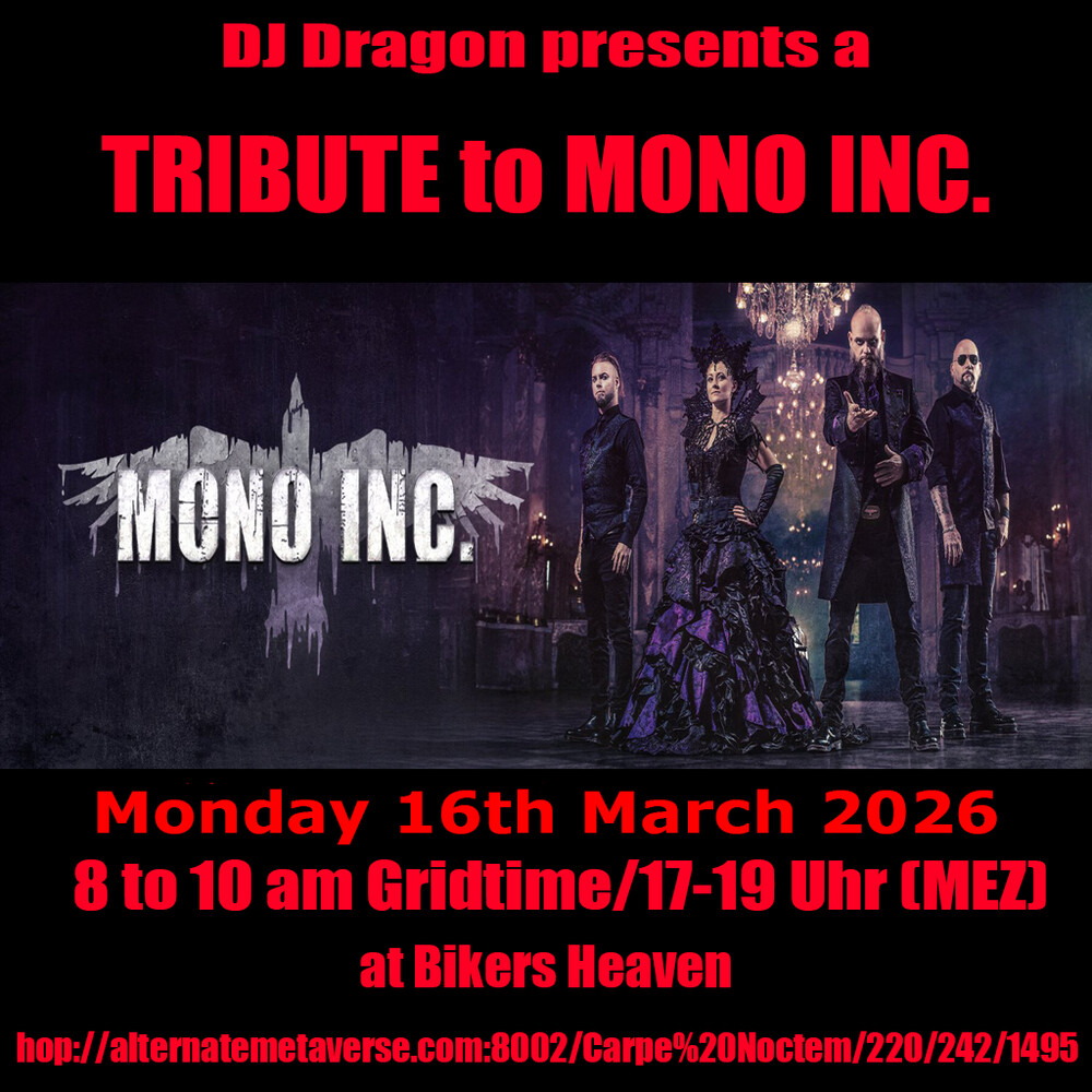 MONO INC. with DJ Dragon Monday 16th February 2026 8 to 10 am Gridtime (16-18 Uhr MEZ) at Bikers Heaven. hop://alternatemetaverse.com:8002/Carpe%20Noctem/229/239/1495 if hop doesnt work just send me an IM. Listen: http://dragon.radioamv.com Join us at https://alternatemetaverse. 0 comments |