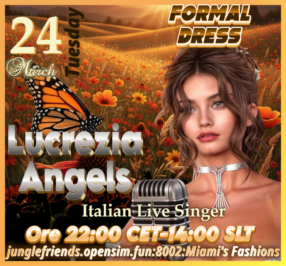 " Lucrezia Angels " Italian Live Singer in Concertin 17 hours | 2026-03-24 14:00 SLT | Miami's Fashions | Added by Mariposita MiamiYou are invited to the sweet Lucrezia's concert at Jungle Friends in a fantastic atmosphere with true friends!!!