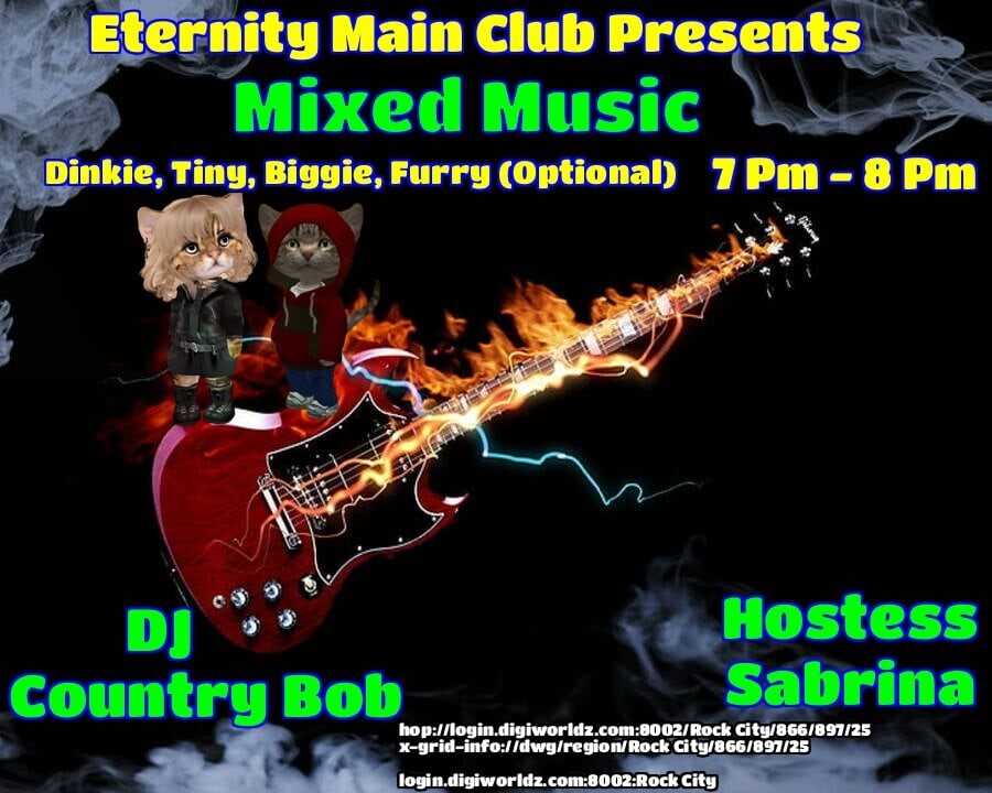 DJ Country Bob and Hostess Sabrina Dementros at the Eternity MAIN Venue!Rock City in 13 hours | 2025-10-16 19:00 SLT*6-8PM OST Grid Time! - Ready For Some Fun? Join Us! - THEME: Dinkie, Tiny, Biggy or Furry - Music: Mixed - *GUARANTEED A GOOD TIME, CYA THERE!