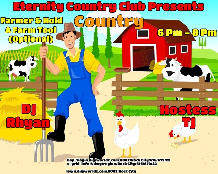 DJ Rhyan Creed and Hostess Sabrina Dementros at the Eternity COUNTRY Venue!Rock City in 1 days | 2025-10-17 18:00 SLT*6-8PM OST Grid Time! - Ready For Some Fun? Join Us! - THEME: Farmer & Hold a Farm Tool - MUSIC: Country - Bull Rides For A Prize *GUARANTEED A GOOD TIME, CYA THERE!