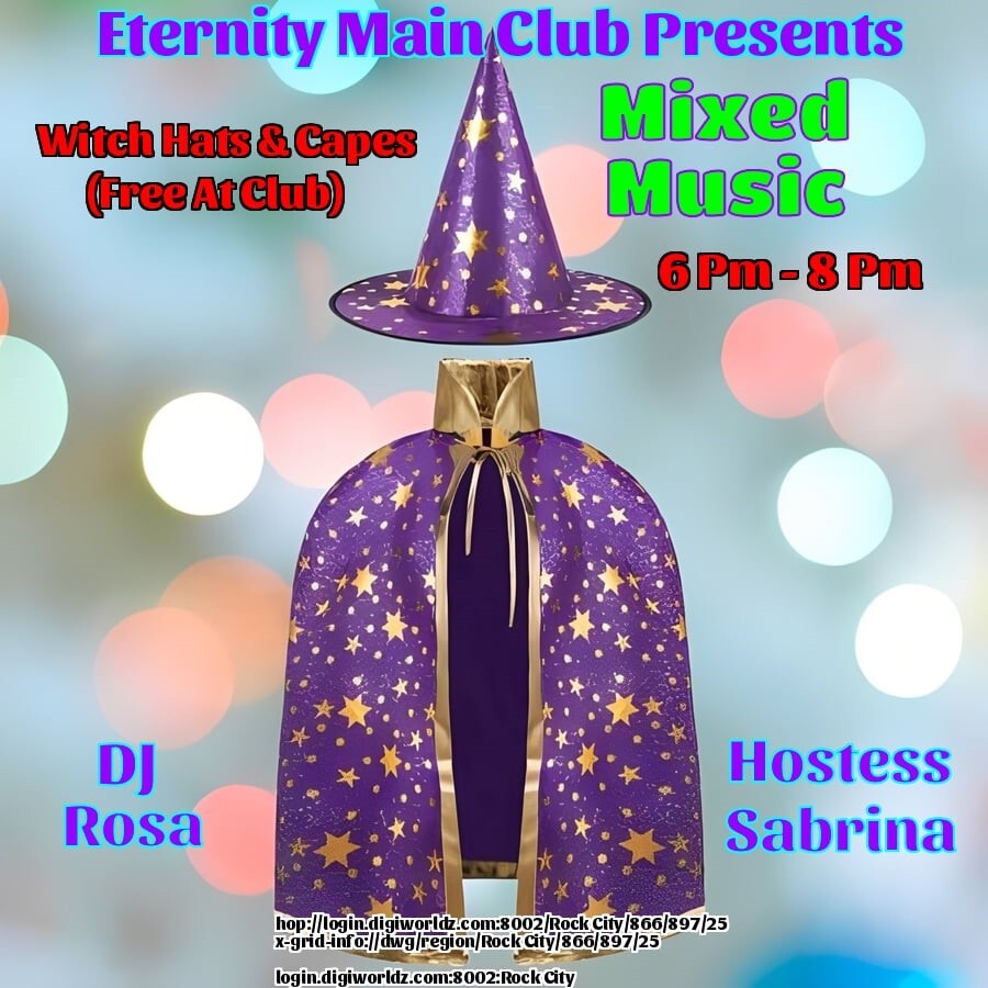 DJ Rosa Alekseev and Hostess Sabrina Dementros at the Eternity Night Club MAIN Venue!Rock City in 4 days | 2025-10-20 18:00 SLT*6-8PM OST Grid Time - *Ready For Some Fun? Join Us! - THEME: Witches Hats & Capes (FREE) - MUSIC: Mixed - *GUARANTEED A GOOD TIME, CYA THERE!