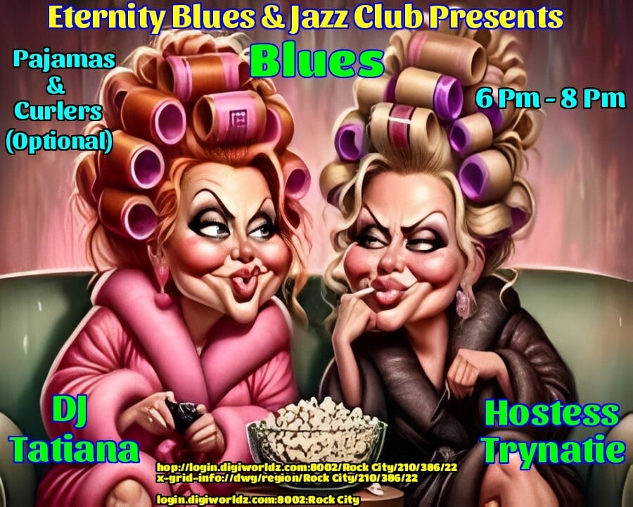 DJ Tatiana Volare and Hostess Trynatie Mason at the Eternity BLUES/JAZZ Venue!Rock City in 5 days | 2025-10-21 18:00 SLT6-8PM OST Grid Time - *Ready For Some Fun? Join Us! - THEME: Pajamas & Curlers (FREE) - MUSIC: Jaz and Blues - RAFFLE: by Cosplay Manga A Diluc Avatar (Artman Xue) - HG FRIENDLY! - *GUARANTEED A GOOD TIME, CYA THERE!